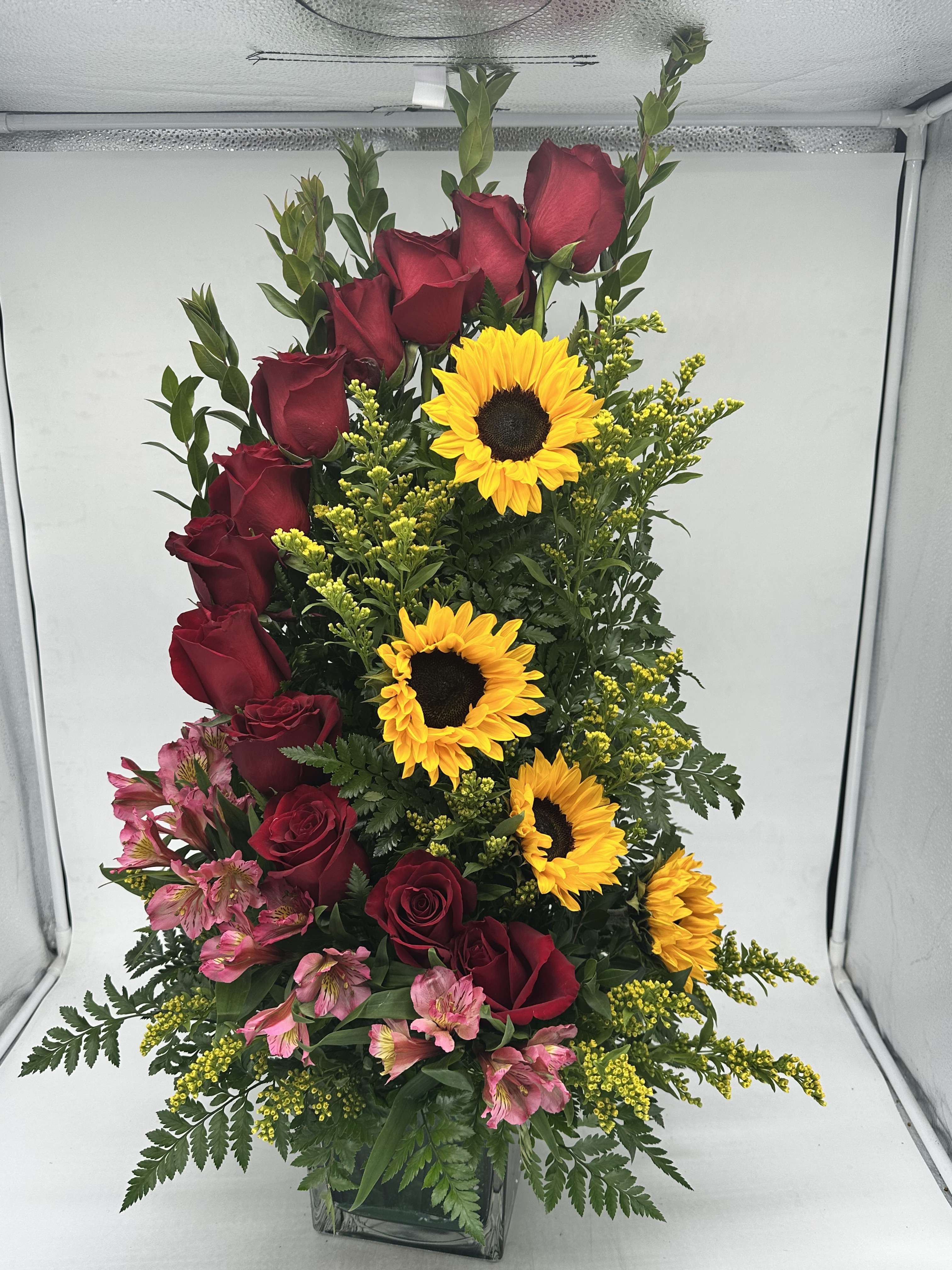 12 Red Roses, Sunflowers Alstroemeria, Solidago , wax , Mirtle
